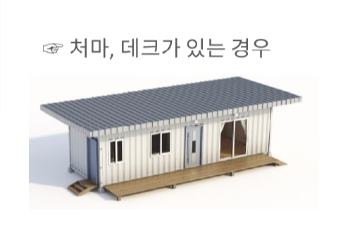 | 연면적 33 ㎡ 이하 (데크.정화조 등 별도) - (처마) 외벽 중심선에서 1m 이내 허용 - (데크) 가장 긴 외벽에 1.5m 를 곱한 면적까지 허용 - (주차장) 주차장법에서 정한 주차장 1면 허용 |