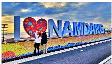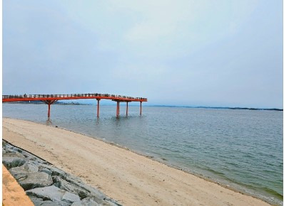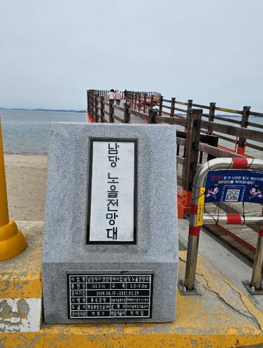 '해넘이 명소인 남당 노을 전망대'는 길게 다리를 바다 쪽으로 걸을 수 있게 건축한 예쁜 붉은색 다리입니다. 물때를 보고 방문하시면 더 좋을 것 같은 장소로 물때가 만조 때 가면 바다 위에 둥둥 뜨는 듯한 그 기분도 색다르답니다