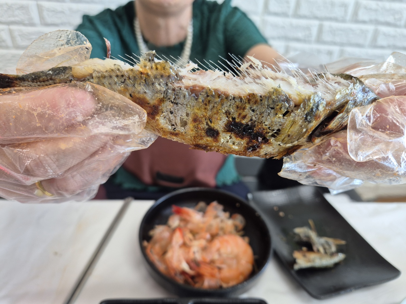 2인이 먹기에도 충분한 양인 것 같았고 머리는 버터에 튀겨서 달라고 하면 추가요금 5,000원이 추가되고 우리는 바삭하게 구워서 먹었는데 맛있었습니다. 주인분께서 서비스로 전어구이를 내주셨습니다. 먹느라 사진을 남기지 모해 지인이 드시던 전어구이를 사진에 남겼습니다.